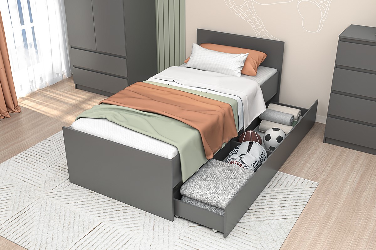 Строгая, лаконичная односпальная кровать из набора мебели Кэт-1, с прочным основанием идеально подойдёт как для комнаты подростка, так и для спальни взрослого человека.