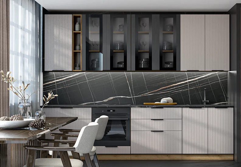 Кухонные гарнитуры с рельефными фасадами выглядят утонченно и стильно, а в сочетании с грамотно подобранными цветами становятся уникальными. Вы можете получить яркий эффект, создав акцентную зону из модулей данной