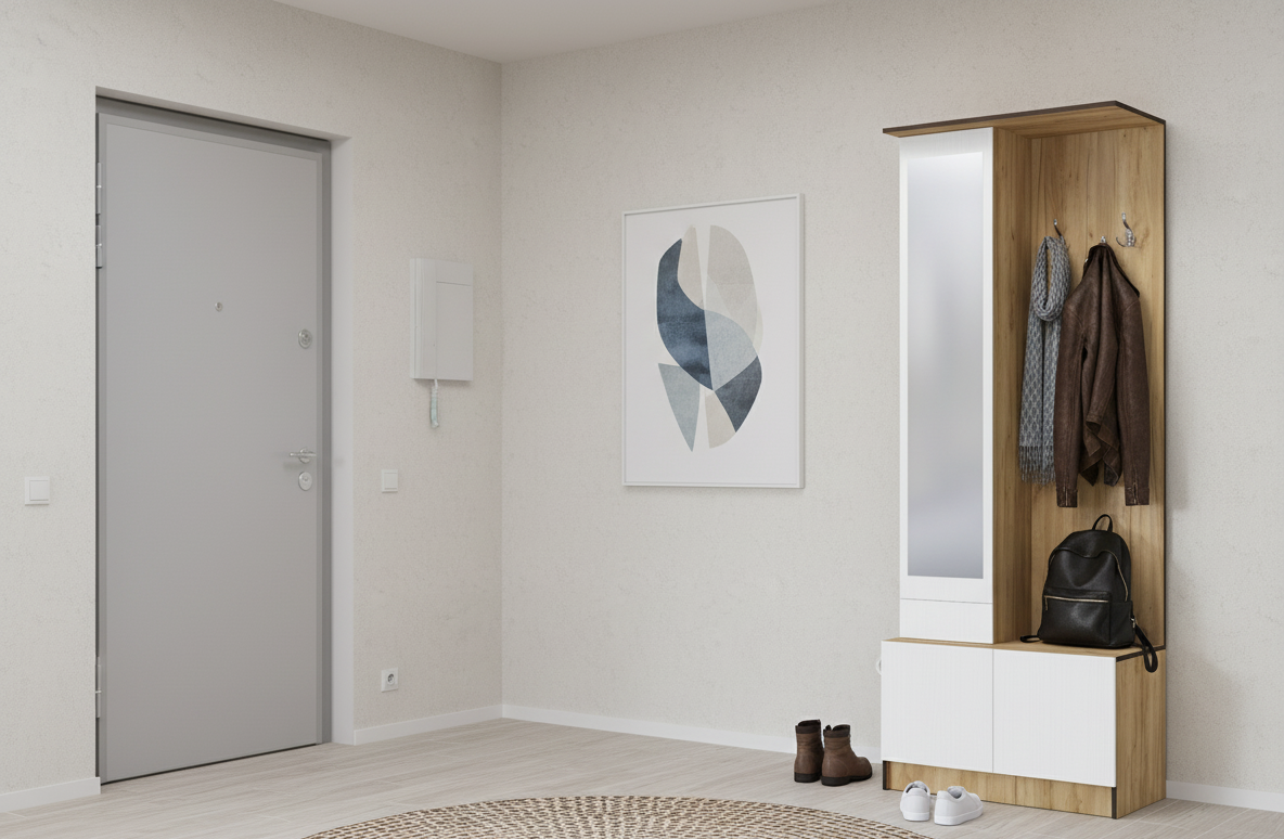 Компактная модель для небольшой прихожей. Данная модель вместительна и обладает всем необходимыми элементами и нишами для хранения, которые должна включать в себя современная прихожая.