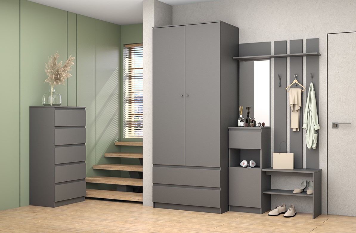 - шкаф 2 створчатый высокий. За распашными дверями находятся антресольная полка и металлическая штанга для одежды; внизу - два выдвижных ящика (902х2204х574 мм);