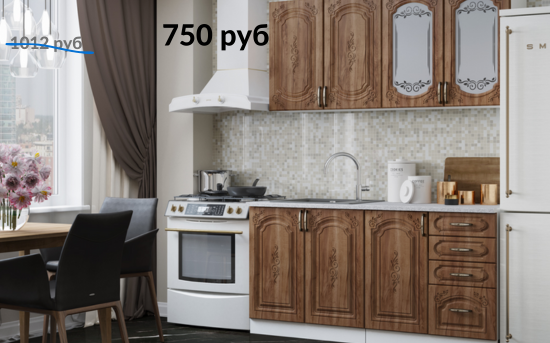 Недорогая кухня в классическом стиле с фасадами «под дерево» с фрезеровкой. Узор на стеклах и фасадах.